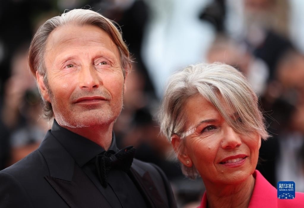 5月16日,在法國(guó)戛納舉行的第76屆戛納國(guó)際電影節(jié)上,演員麥德斯·米科爾森攜妻子亮相開幕式紅毯。   新華社記者 高靜 攝