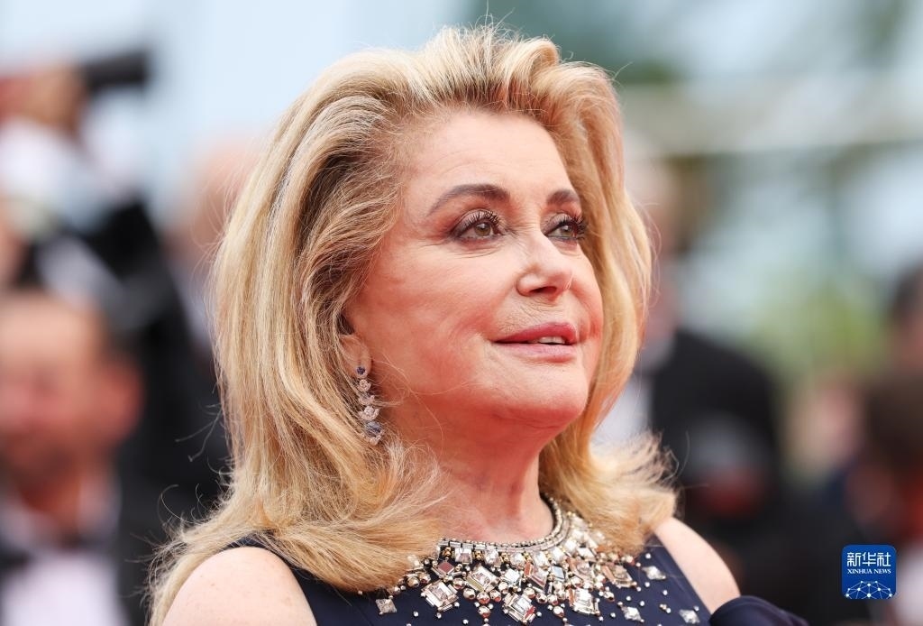 5月16日,在法國(guó)戛納舉行的第76屆戛納國(guó)際電影節(jié)上,演員凱瑟琳·德納芙亮相開幕式紅毯。   新華社記者 高靜 攝