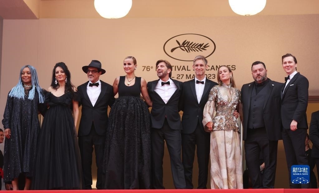 5月16日,在法國(guó)戛納舉行的第76屆戛納國(guó)際電影節(jié)上,主競(jìng)賽單元評(píng)審團(tuán)主席、瑞典導(dǎo)演魯本·奧斯特倫德(中)攜眾評(píng)委亮相開幕式紅毯。   新華社記者 高靜 攝