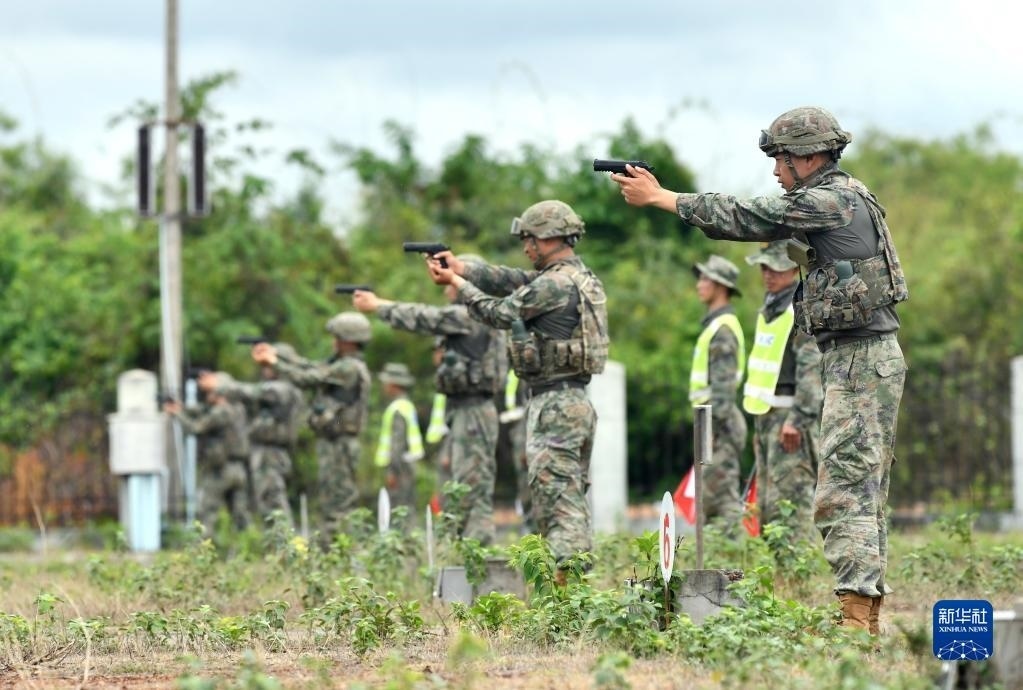 5月13日,在老撾人民軍庫瑪?shù)W(xué)院訓(xùn)練場,中方參演官兵進(jìn)行手槍射擊示范。   新華社發(fā)(陽吉成 攝)