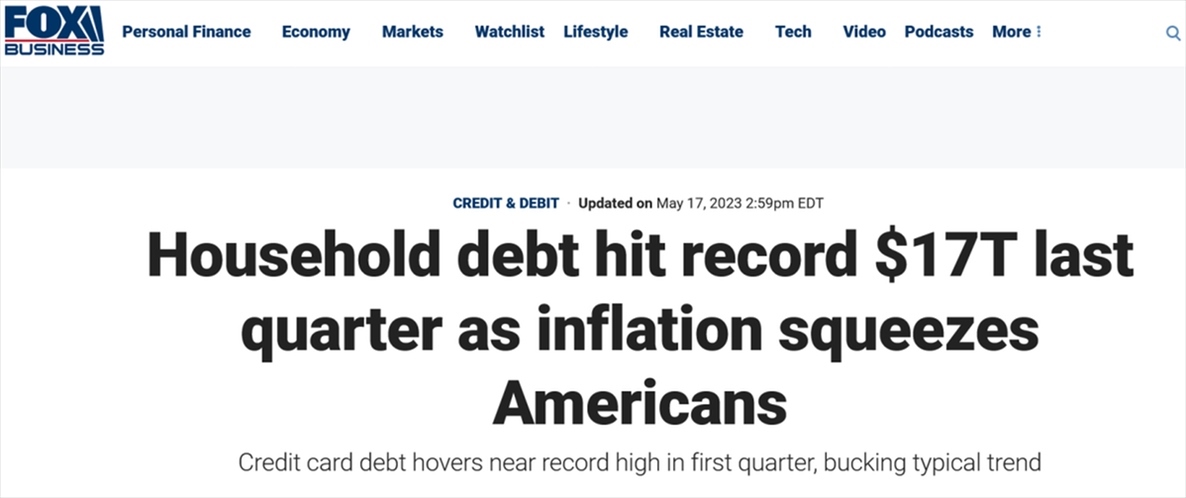 中國日報(bào)網(wǎng)5月19日電 美國紐約聯(lián)儲(chǔ)本周發(fā)布的最新報(bào)告顯示,2023年一季度,美國家庭債務(wù)創(chuàng)下新紀(jì)錄,債務(wù)總額已達(dá)到17.05萬億美元,相比2022年第四季度增長了1480億美元,增幅達(dá)到0.9%,比2019年底疫情暴發(fā)前高出了2.9萬億美元。