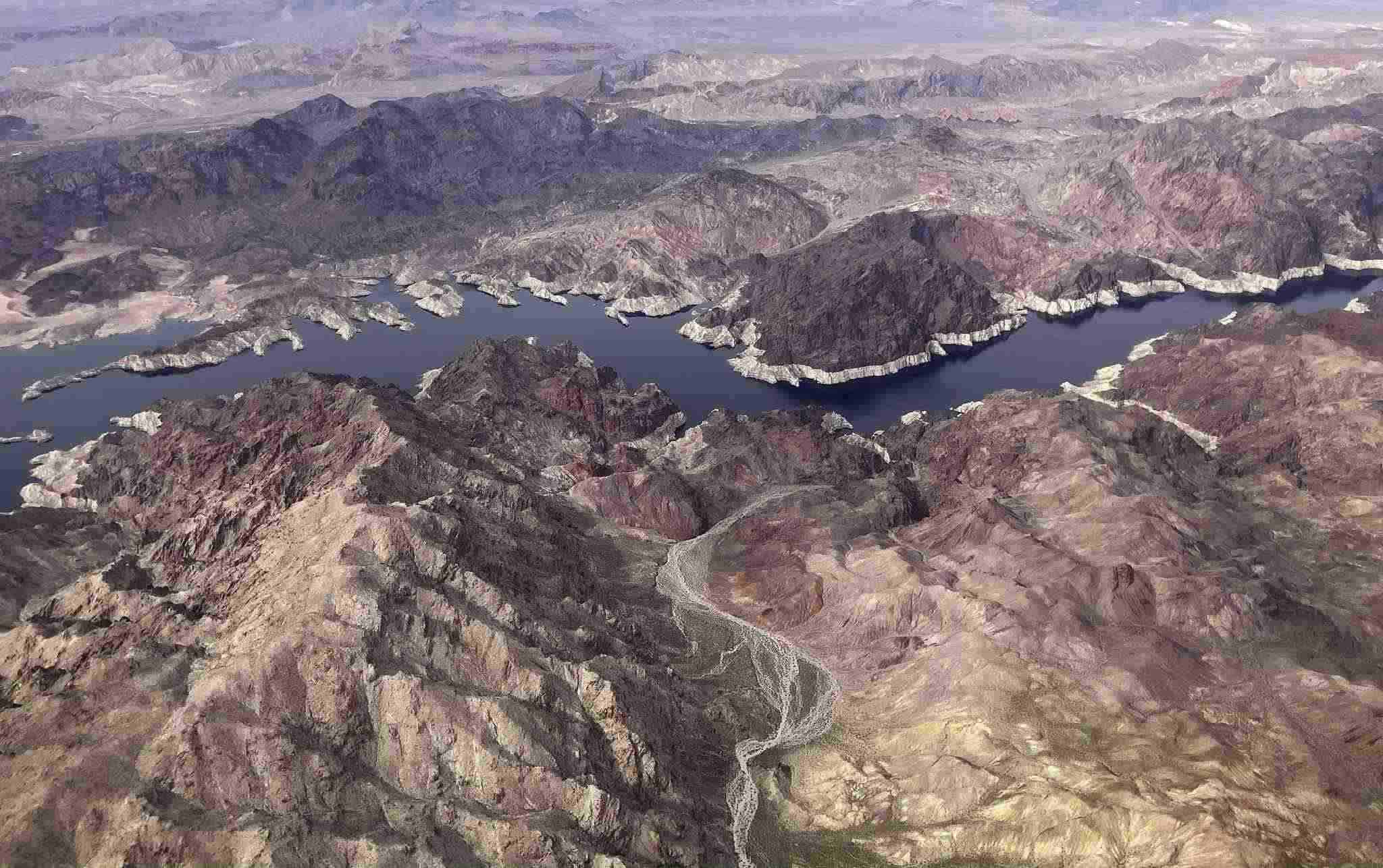 當(dāng)?shù)貢r間2023年4月16日,美國內(nèi)華達(dá)州,棕色的科羅拉多河流經(jīng)水位下降的米德湖。