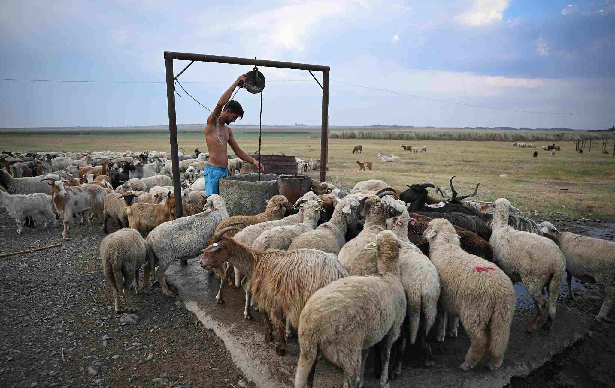 當(dāng)?shù)貢r間2022年7月28日,羅馬尼亞斯洛博齊亞,牧羊人在阿瑪拉湖床旁的井打水。