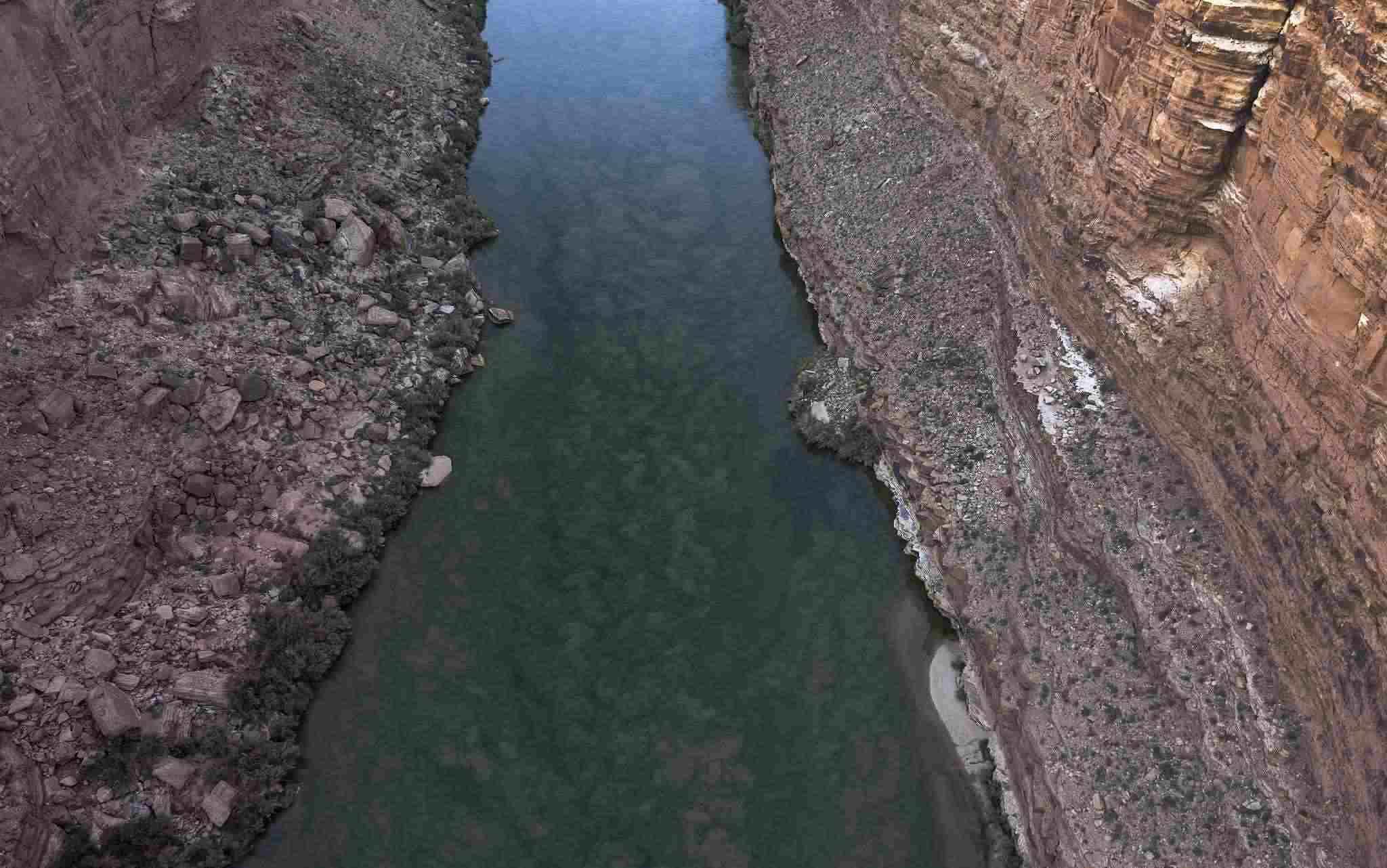當(dāng)?shù)貢r間2022年8月31日,美國亞利桑那州,鮑威爾湖下游的科羅拉多河通過大理石峽谷時,沉積物被攪動。