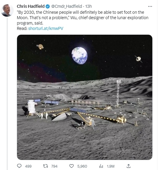 據(jù)報道,加拿大航天局前宇航員克里斯·哈德菲爾德在社交媒體推特上轉發(fā)了CGTN的一篇報道,他同時寫道,“中國探月工程總設計師吳偉仁說,‘到2030年,中國人的足跡一定能夠踏上月球。這不是個問題?!?/p>