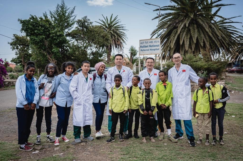 5月9日,在厄立特里亞首都阿斯馬拉的哈利貝特醫(yī)院門口,中國醫(yī)療隊隊員與附近學校兒童合影。新華社記者王冠森攝