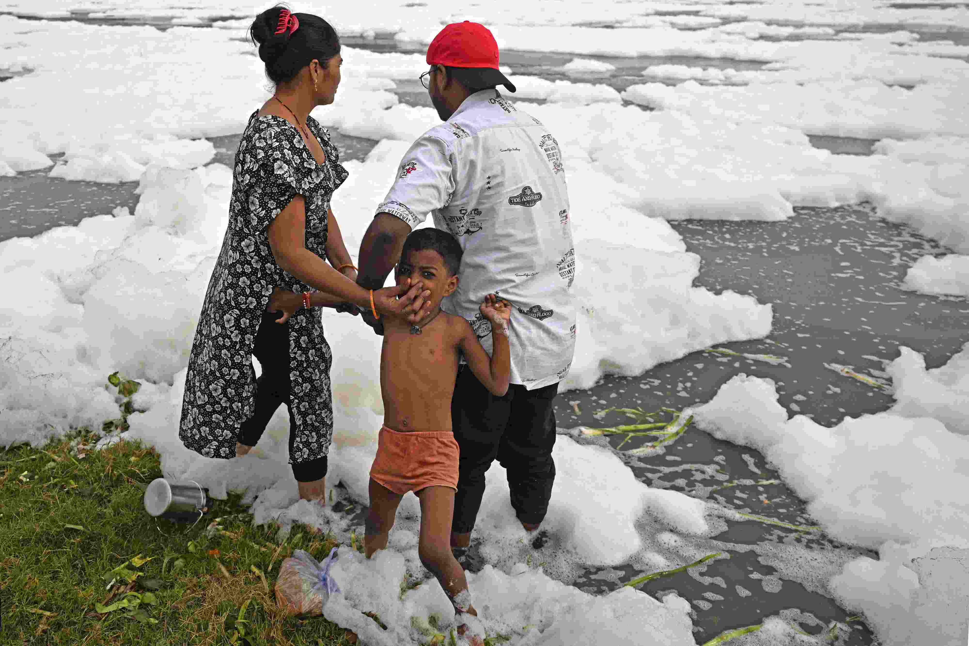 當(dāng)?shù)貢r間2023年6月4日,印度新德里,世界環(huán)境日前夕,人們在充滿有毒泡沫的亞穆納河中沐浴。 視覺中國