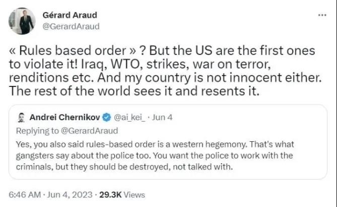 在另一條推文中,阿羅指出,從美國在伊拉克戰(zhàn)爭、世貿(mào)組織違規(guī)、所謂“反恐戰(zhàn)爭”中的表現(xiàn)可見,是美國首先違反了“基于規(guī)則的秩序”。世界上其他國家看到了這一點(diǎn),對此感到憤慨。