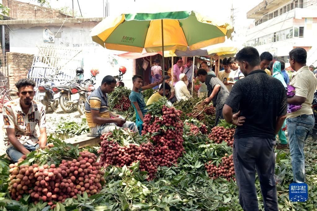 這是6月4日在孟加拉國(guó)迪納杰布爾市場(chǎng)中拍攝的待售的荔枝。新華社發(fā)