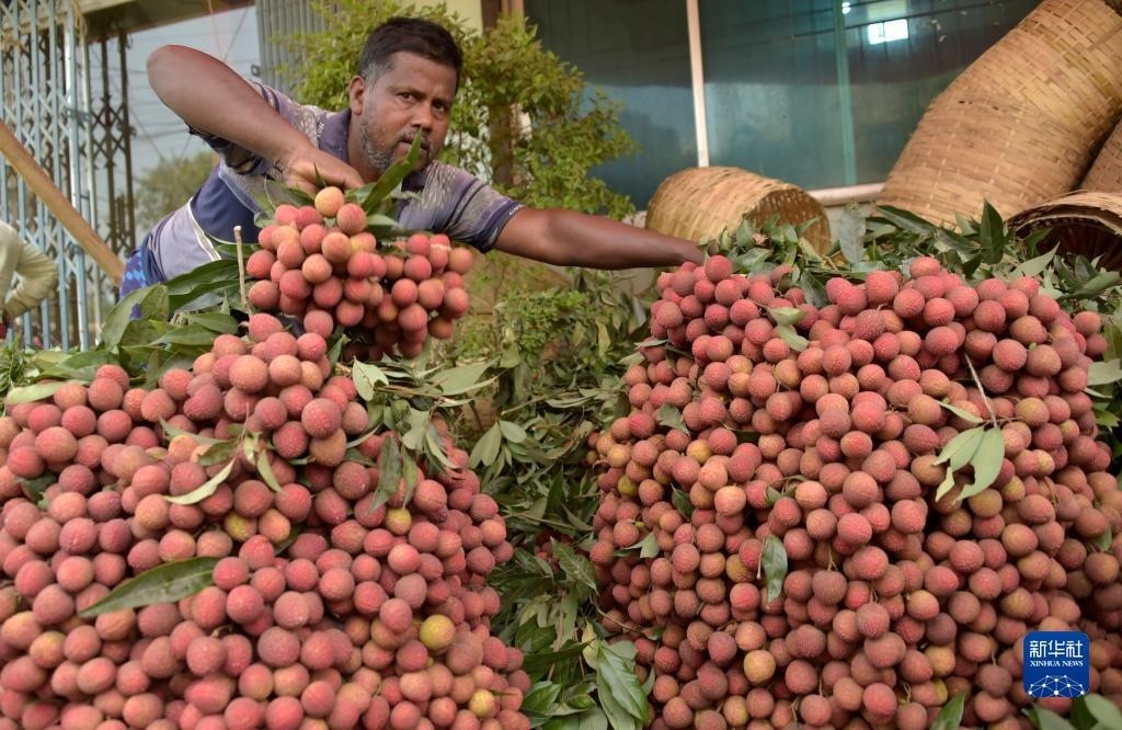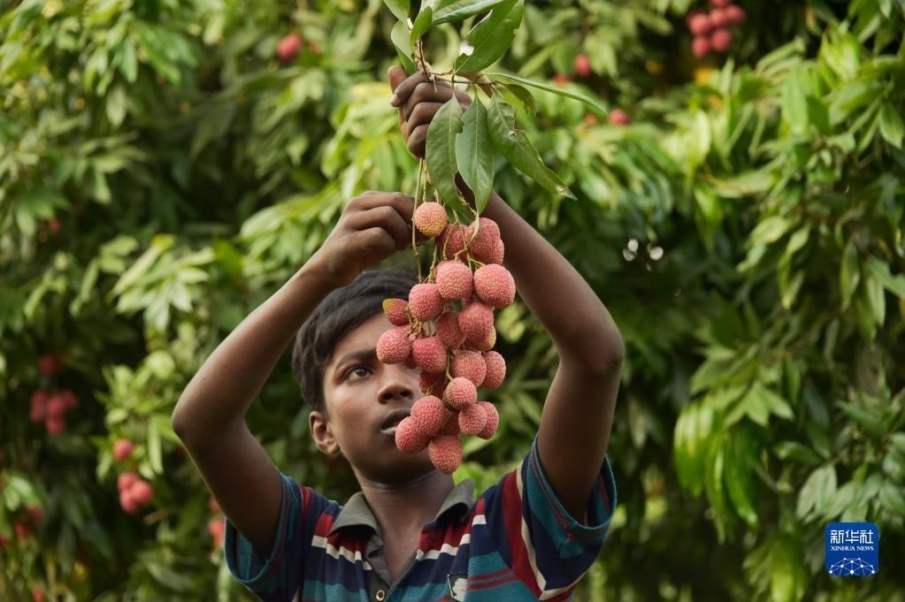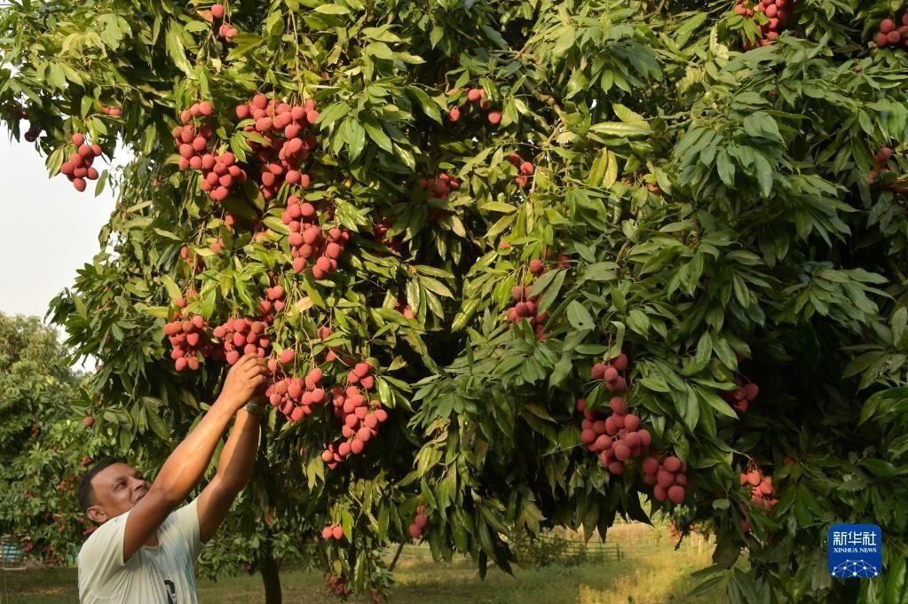 6月4日,農(nóng)民在孟加拉國(guó)迪納杰布爾的果園里采摘荔枝。新華社發(fā)