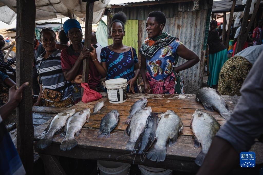 6月11日,人們?cè)谔股D醽喣啡f(wàn)扎省維多利亞湖畔附近賣魚。