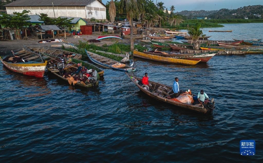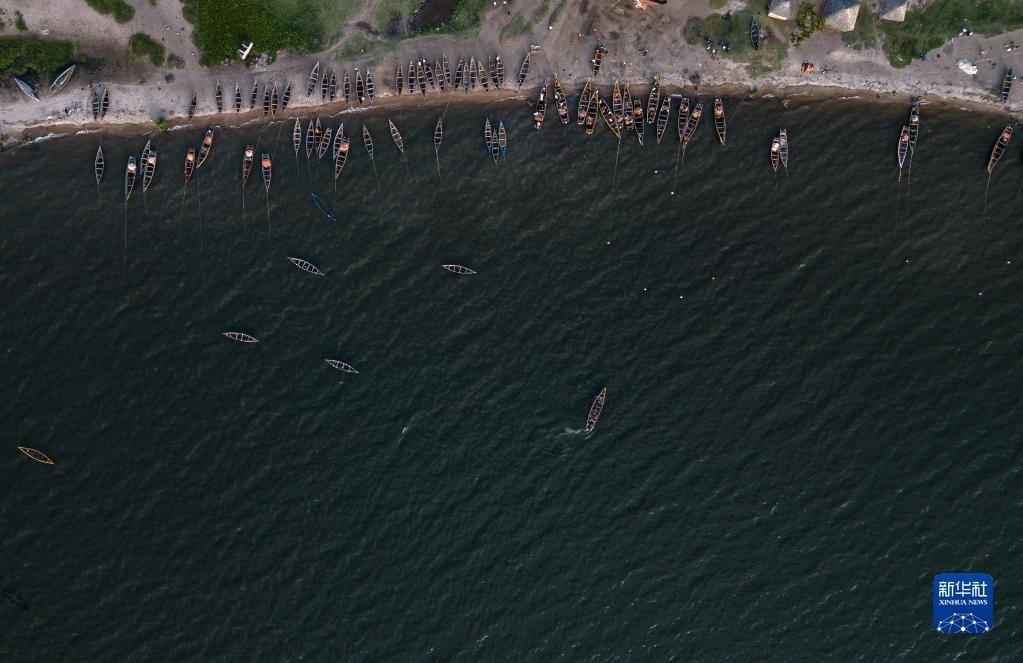 這是6月11日拍攝的坦桑尼亞姆萬(wàn)扎省維多利亞湖畔的漁船(無(wú)人機(jī)照片)。