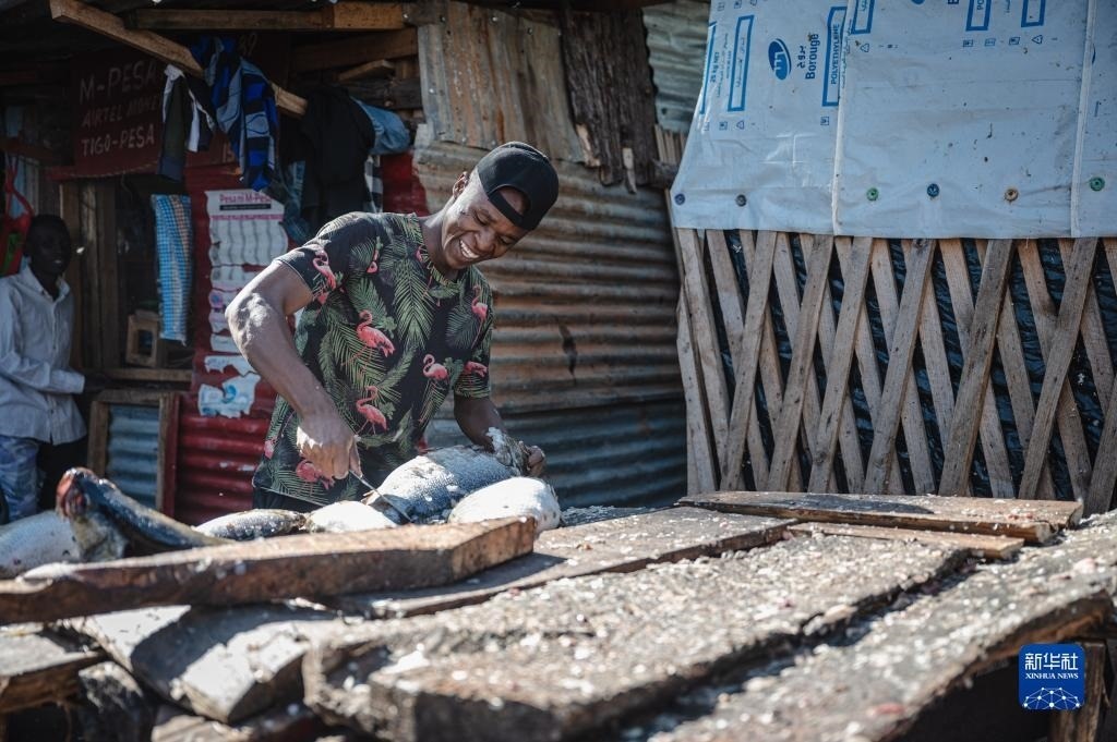 6月11日,在坦桑尼亞姆萬(wàn)扎省維多利亞湖畔,漁民處理漁獲。