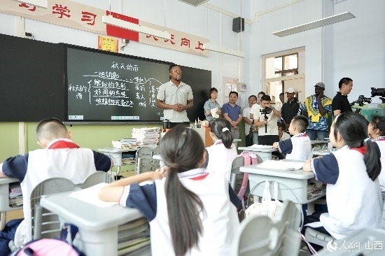 圖為李昊瑞給午亭小學(xué)三年級(jí)一班的同學(xué)表演繞口令。人民網(wǎng) 盧鵬宇攝