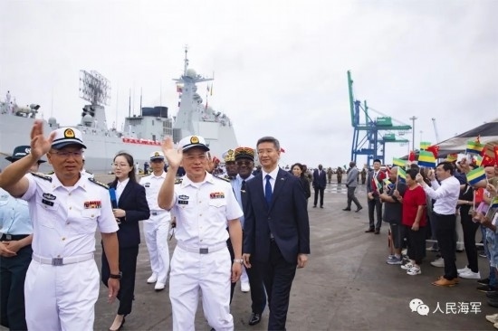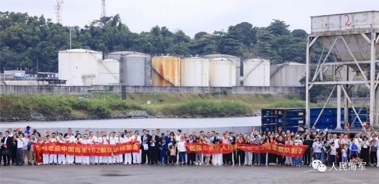 當(dāng)日上午9時,懸掛著中加兩國國旗的編隊艦艇緩緩靠泊奧文多港碼頭,中國駐加蓬大使李津津及使館工作人員、當(dāng)?shù)刂匈Y機(jī)構(gòu)人員、華人華僑代表,加蓬國防部秘書長彭吉中將及官兵代表等300余人位碼頭迎接。