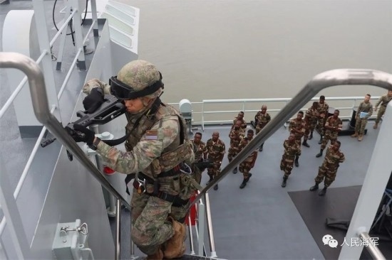 微山湖艦上,編隊特戰(zhàn)隊員向加方海軍陸戰(zhàn)隊員介紹了我特戰(zhàn)武器裝備,演示教授了滑降和艙室搜索等科目,并與加方海軍陸戰(zhàn)隊員進(jìn)行了反恐反海盜、武力營救等專業(yè)交流。