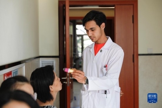 甘肅中醫(yī)藥大學(xué)針灸推拿專業(yè)的土庫曼斯坦留學(xué)生迪達(dá)(左)在臨床實習(xí)中為患者檢查眼睛(7月28日攝)。新華社記者 方欣 攝