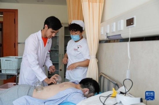 甘肅中醫(yī)藥大學(xué)針灸推拿專業(yè)的土庫曼斯坦留學(xué)生迪達(dá)(左)在甘肅中醫(yī)藥大學(xué)附屬醫(yī)院護(hù)士的指導(dǎo)下為患者進(jìn)行拔罐治療(7月28日攝)。新華社記者 方欣 攝