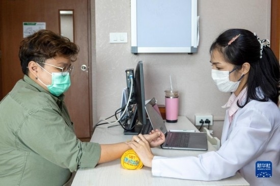 7月21日,在泰國曼谷岐黃泰國中醫(yī)藥中心,一名醫(yī)生在為患者診脈。新華社記者 林昊 攝