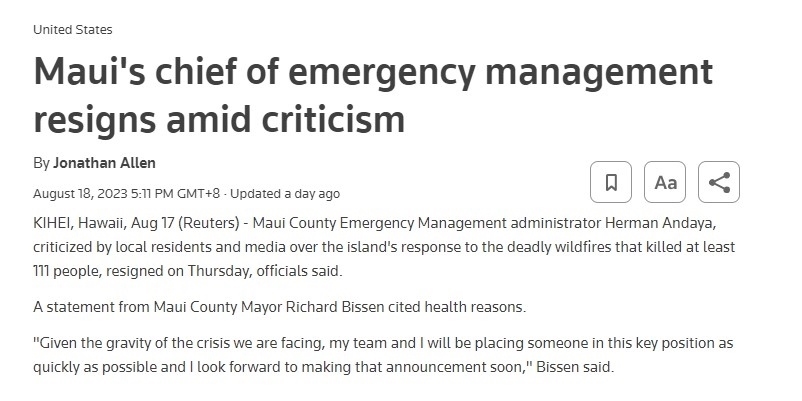 路透社8月18日報道,毛伊縣緊急事務管理機構負責人赫爾曼·安達亞在當?shù)鼐用窈兔襟w的一片“救災不利”的譴責聲中辭職。截至17日,致命山火已經(jīng)造成至少111人死亡。一些毛伊島居民認為,如果能更早拉響警報,會挽救更多生命。
