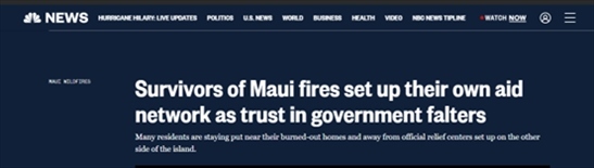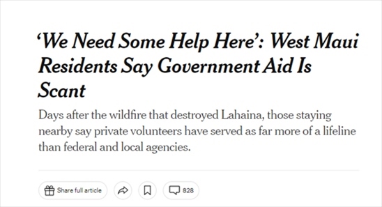 《紐約時報》8月14日報道,聯(lián)邦緊急事務管理局要求人們在網(wǎng)站上注冊后才能獲得臨時住房等援助,但是毛伊島西部受災最嚴重地區(qū)目前依然處于斷電斷網(wǎng)中,那里的災民根本無法登錄網(wǎng)站。