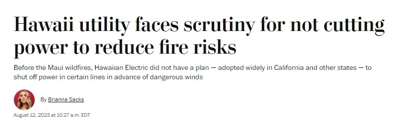 據(jù)《華盛頓郵報》8月12日報道,三家法律公司已代表受害者對夏威夷電氣公司提起集體訴訟,指控該公司未在強風天氣來臨前切斷供電。該公司下屬的一個變電站8日曾出現(xiàn)電線倒塌事故,事發(fā)地點靠近最初起火點。