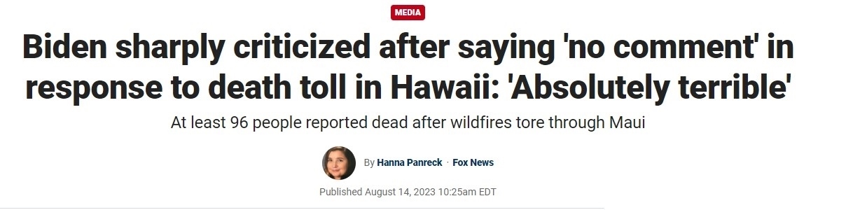 福克斯新聞網(wǎng)8月14日報道稱,當?shù)貢r間13日上午,毛伊島救災仍在進行,美國總統(tǒng)拜登卻在其位于特拉華州里霍伯斯海灘的海邊別墅過周末。當被問及毛伊島大火造成的死亡人數(shù)正不斷上升的問題時,拜登表示“不予置評”。