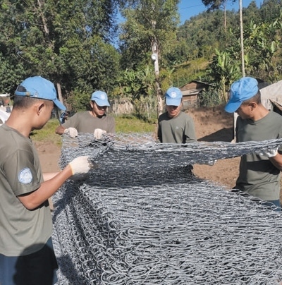自去年9月部署到任務(wù)區(qū)以來(lái),第二十六批維和工兵分隊(duì)已完成32項(xiàng)工程任務(wù)、26項(xiàng)工程勘察,累計(jì)修筑道路52公里、搭建板房50間、構(gòu)筑圍墻2100米。今年5月,南基伍省卡萊亥地區(qū)遭受強(qiáng)降雨和洪水災(zāi)害,造成400多人死亡,上千座民居被沖毀。關(guān)鍵運(yùn)輸線路上的魯濟(jì)拉橋被洪水沖垮,切斷了人道主義援助物資的運(yùn)輸線,給當(dāng)?shù)孛癖娊煌ǔ鲂泻涂购榫葹?zāi)造成嚴(yán)重影響。工兵分隊(duì)接到任務(wù)后,第一時(shí)間奔赴災(zāi)區(qū)一線,在河邊安營(yíng)扎寨,執(zhí)行工程救援。7月,嶄新的魯濟(jì)拉橋已經(jīng)順利完工。