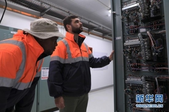 8月10日,在南非北開普省德阿鎮(zhèn),當?shù)鼐用?、變電站工作人員達斯溫·巴松(左)與變電站副主管雷加特·范滕德在龍源南非公司德阿風電項目變電站工作。新華社記者 董江輝 攝