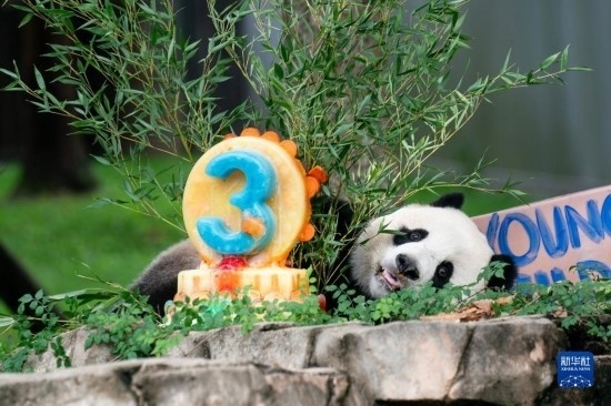 8月21日,大熊貓幼崽“小奇跡”在美國首都華盛頓史密森學(xué)會國家動物園享用生日蛋糕。新華社記者 劉杰 攝