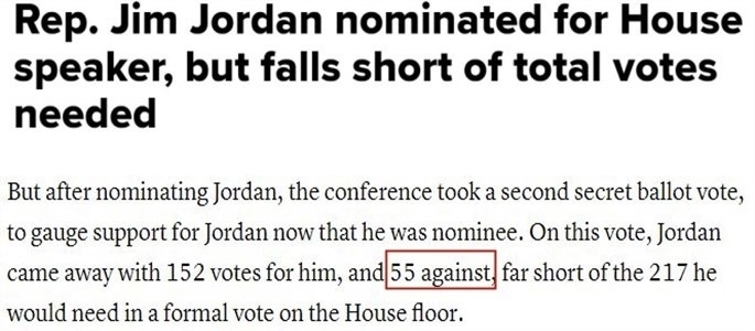 據(jù)報(bào)道,喬丹13日贏得提名后,共和黨人立刻舉行了第二輪閉門投票,以檢驗(yàn)喬丹所獲黨內(nèi)支持情況。結(jié)果顯示,152名共和黨人將在全院表決中投贊成票,55名共和黨人將投反對(duì)票。