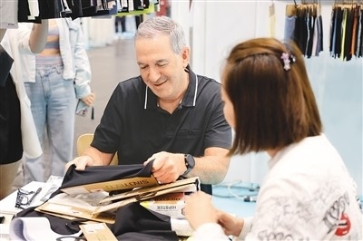7月19日,在美國紐約舉辦的第24屆中國紡織品服裝貿(mào)易展覽會(huì)上,客商(左)在一家中國上海的企業(yè)展位選看面料。