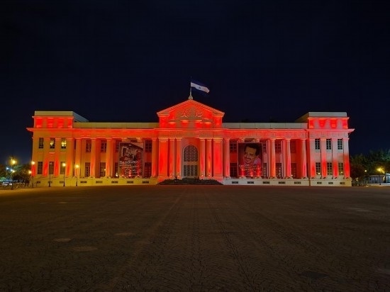 2022年1月31日,尼加拉瓜首都馬那瓜市中心標(biāo)志性建筑國家宮點亮“中國紅”。新華社發(fā)(中國駐尼加拉瓜使館供圖)