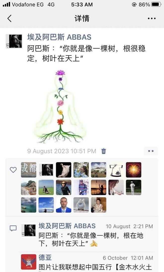 “你就是像一棵樹,根很穩(wěn)定,樹葉在天上?!边@是阿巴斯微信朋友圈里的一句話,也是他生活和工作的寫照。那深入泥土的遒勁的“根”,是他對中文和中國文化的不斷深入學習,是不斷發(fā)展的中埃友誼,是不斷走深走實的共建“一帶一路”倡議;那姿態(tài)昂揚、伸向天空的輕盈的“葉”,是他由“小我”走向“大我”穩(wěn)步實現(xiàn)的夢想,是他對更美好明天的熱切期待。