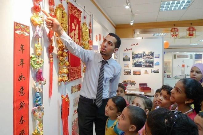 一位埃及青年正認真向圍在身邊的學生們講解中國傳統(tǒng)文化中的十二生肖。他身穿白色襯衫,系著條紋領帶,學生們仰起頭,專心致志地聆聽講解。這位埃及青年便是時年28歲的阿巴斯。作為開羅中國文化中心主任助理,他經(jīng)常在這里向埃及學生和民眾介紹中國的文房四寶和京劇臉譜,講解中國的傳統(tǒng)節(jié)日和風景名勝,并帶領孩子們做手工,燈籠、風箏和寫對聯(lián)往往是他們最喜愛的內容。在當年埃及的動蕩時局下,中國文化中心照常對外開放,各種活動有序開展。首屆大使杯“魅力埃及,多彩中國”攝影大賽作品展就吸引了上百名開羅市民前往參觀。