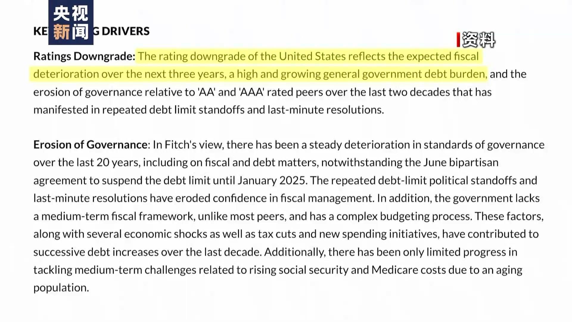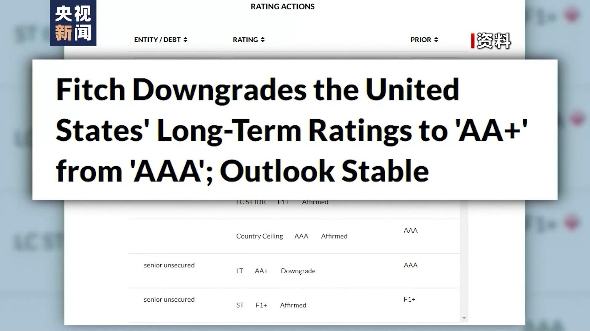 到了2023年8月1日,國際評級機構惠譽將美國長期外幣發(fā)行人違約評級從AAA下調(diào)至AA+。惠譽當天發(fā)表聲明說,下調(diào)美國信用評級主要由于美國政府債務負擔居高不下且不斷加重,未來3年財政狀況預計將持續(xù)惡化。