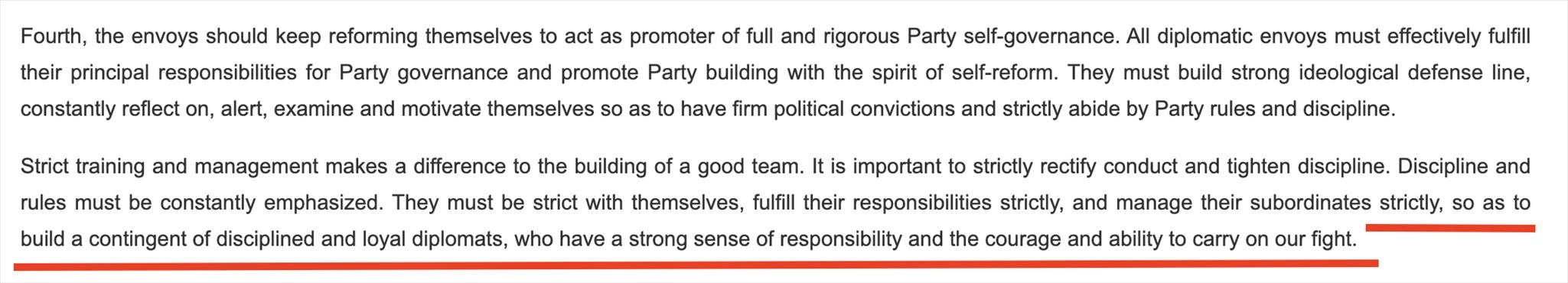 “鐵軍”一詞常見于政府文件或領(lǐng)導(dǎo)人講話,更多的是強調(diào)工作作風(fēng)和紀律。在近年來中國領(lǐng)導(dǎo)人講話中,曾多次出現(xiàn)“紀律監(jiān)察鐵軍”“生態(tài)環(huán)境保護鐵軍”等表述。中國領(lǐng)導(dǎo)人在接見與會使節(jié)時的講話中說:“打造一支對黨忠誠、勇于擔(dān)當、敢斗善斗、紀律嚴明的外交鐵軍?!蓖饨徊烤W(wǎng)站對這句話的英文翻譯(見下圖)同樣強調(diào)外交隊伍的紀律、責(zé)任和勇氣。作為通行做法,世界各國對本國外交人員都有著很高的紀律要求。
