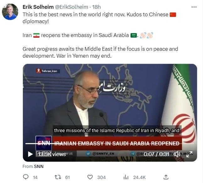 沙伊推進(jìn)復(fù)交 聯(lián)合國(guó)前高官稱贊中國(guó)外交! 當(dāng)?shù)貢r(shí)間3日,聯(lián)合國(guó)前副秘書長(zhǎng)兼環(huán)境規(guī)劃署前執(zhí)行主......