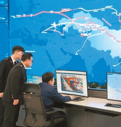 在中哈(連云港)物流合作基地?cái)?shù)字化調(diào)度中心,海關(guān)關(guān)員在對中歐班列動(dòng)態(tài)、現(xiàn)場裝卸情況等進(jìn)行實(shí)時(shí)監(jiān)控。近年來,連云港海關(guān)還創(chuàng)新應(yīng)用中歐班列“保稅+出口”集裝箱混拼、“鐵路快速通關(guān)”等通關(guān)便利化舉措,不斷提升貨物通關(guān)效率。本報(bào)記者 石 暢攝
