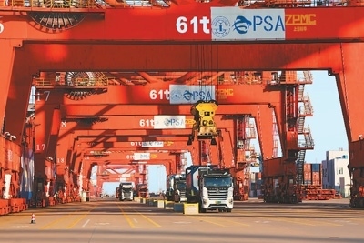 貨輪停靠連云港港口后,集裝箱通過“船車直取”的模式,被直接吊裝上短駁車,分流至中哈(連云港)物流合作基地,貨物集結(jié)后被裝上火車,運(yùn)往中亞、歐洲等國家和地區(qū)。 本報(bào)記者 石 暢攝