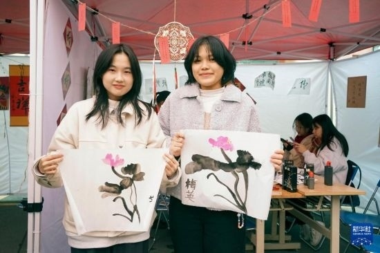 1月24日,“歡慶春節(jié)暨中越年俗文化交流體驗(yàn)”活動(dòng)在越南河內(nèi)的河內(nèi)大學(xué)舉辦,約500名學(xué)生及社會(huì)各界人士參加了書法、中國(guó)畫、剪紙、奧黛漢服秀和歌舞表演等體驗(yàn)活動(dòng),還品嘗了春卷、粽子、餃子、湯圓等傳統(tǒng)美食。這是兩名越南學(xué)生在活動(dòng)中展示自己繪制的中國(guó)畫作品。新華社記者 胡佳麗 攝