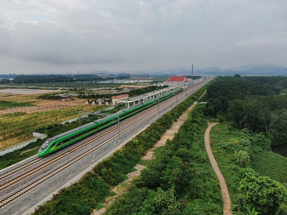 2023年10月22日,動車從位于云南省景洪市勐罕鎮(zhèn)的中老鐵路橄欖壩站駛出(無人機(jī)照片)。