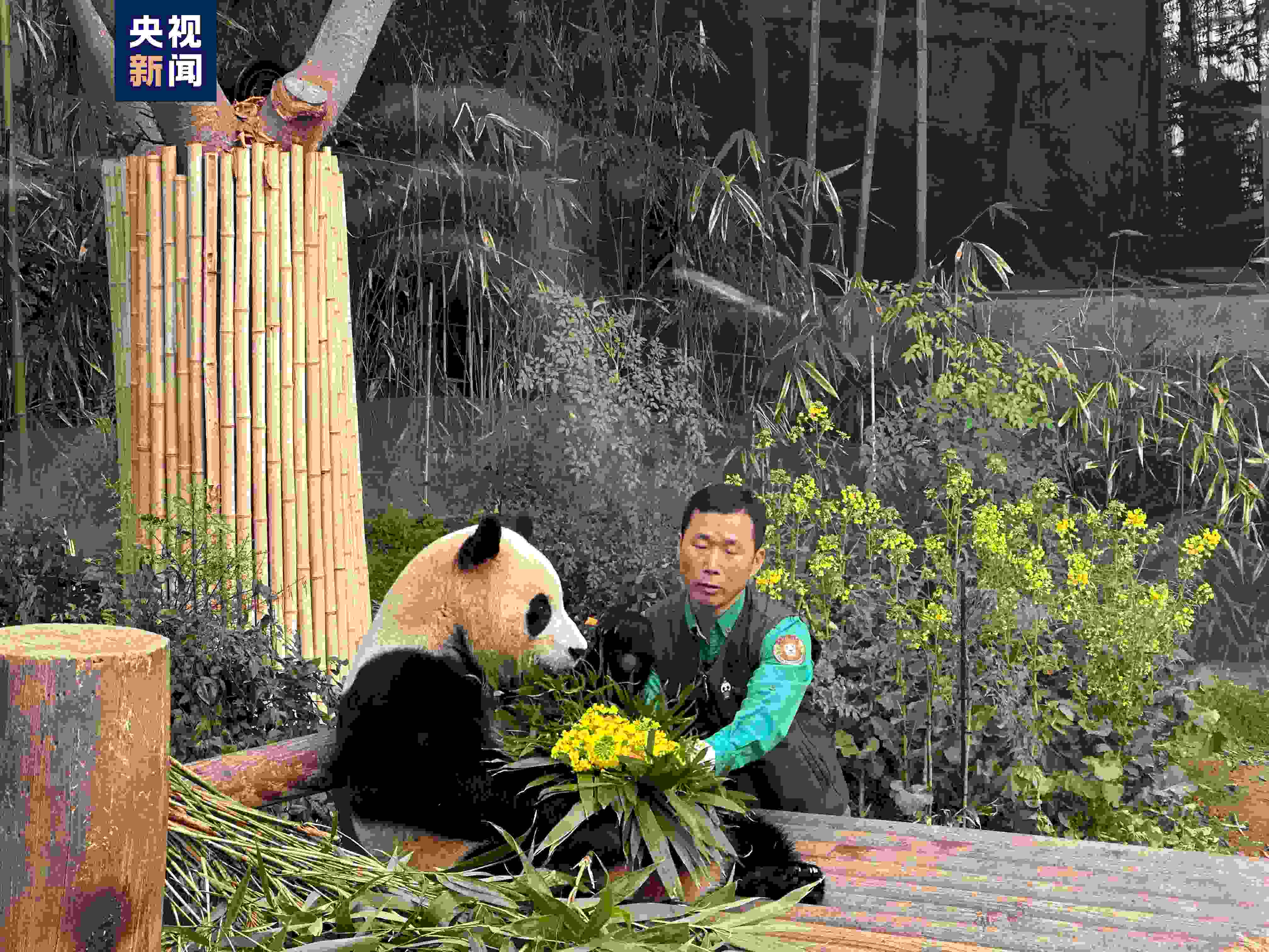 當(dāng)天,“福寶”的飼養(yǎng)員姜哲遠(yuǎn)、宋永寬為福寶準(zhǔn)備了愛心窩頭和竹子制作的“寶家族”全家福,還有寄托著兩位飼養(yǎng)員美好祝福的油菜花束,讓福寶最后一個與韓國觀眾見面的日子充滿了愛與祝福。