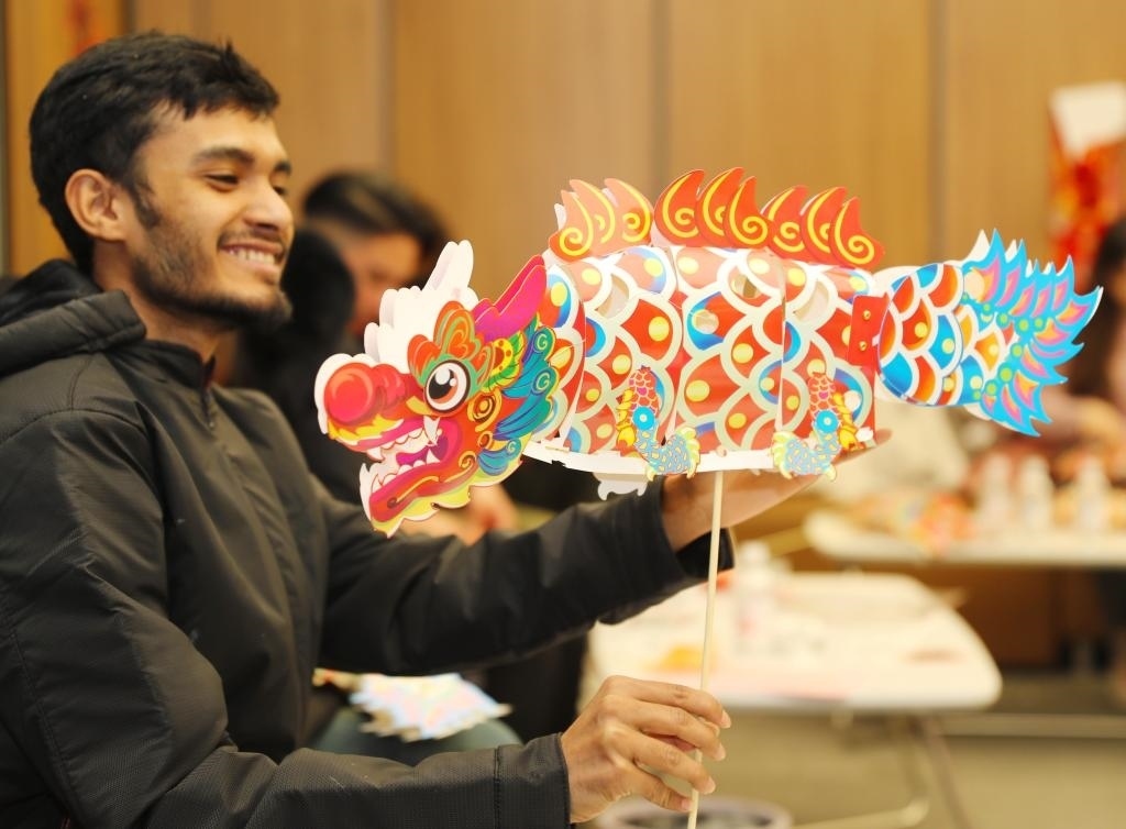 ?2月23日,在山東自貿(mào)試驗區(qū)青島片區(qū),外國留學(xué)生拼裝龍形花燈。新華社發(fā)(張進剛攝)