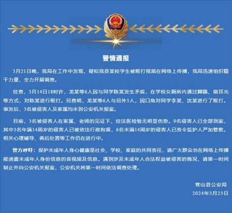 ·四川營山通報一女生遭同學(xué)毆打:9名侵害人全部到案。