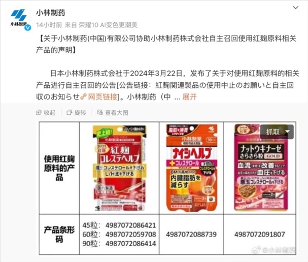 小林制藥生產(chǎn)的紅曲原料除供自家生產(chǎn)保健品外,還出售給其他公司用于釀酒及食品制造等。調(diào)查顯示,“意想不到”的成分存在于小林制藥2023年4月至12月期間生產(chǎn)保健品的原料中。目前使用小林制藥產(chǎn)紅曲原料的食品和調(diào)料召回范圍已擴(kuò)大至日本全國(guó)。