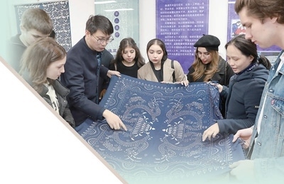 2024年3月20日,在江蘇南通市崇川區(qū)“文化崇川 游我所愛”中外文化交流活動(dòng)中,來自俄羅斯、巴基斯坦、印度尼西亞、盧旺達(dá)等國家的學(xué)生現(xiàn)場了解藍(lán)印花布印染技藝。許叢軍攝(人民視覺)