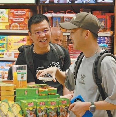 在泰國(guó)曼谷素萬(wàn)那普機(jī)場(chǎng)免稅店,兩名中國(guó)游客正在購(gòu)買當(dāng)?shù)靥厣a(chǎn)品。