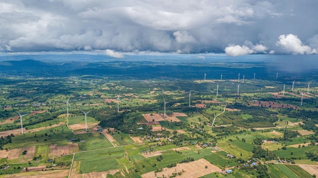 這是2023年10月5日在泰國猜也蓬府拍攝的由中國金風(fēng)科技提供的風(fēng)力發(fā)電機(無人機照片)。新華社記者王騰攝