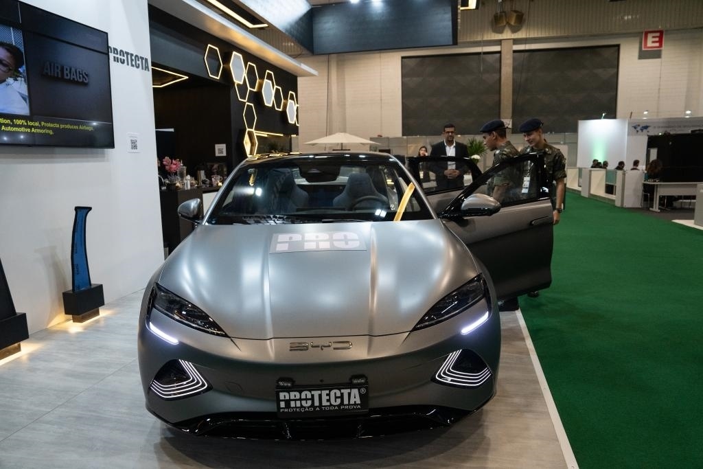 ?4月4日,在巴西圣保羅舉行的巴西防務(wù)展上,參觀者體驗(yàn)一輛經(jīng)過(guò)防彈加固的比亞迪海豹電動(dòng)汽車。新華社記者王天聰攝